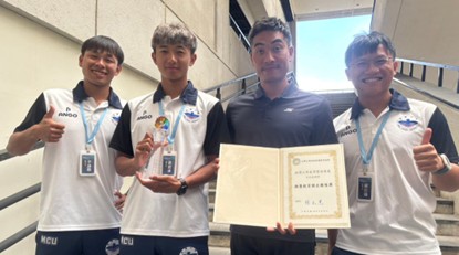 銘傳足球隊曾台霖總教練(右二)將獲獎榮耀歸功於團隊的努力。