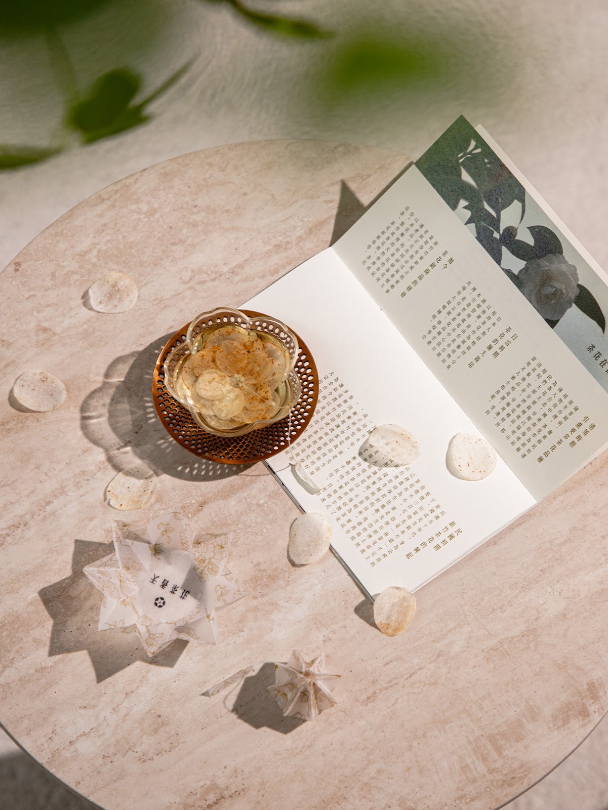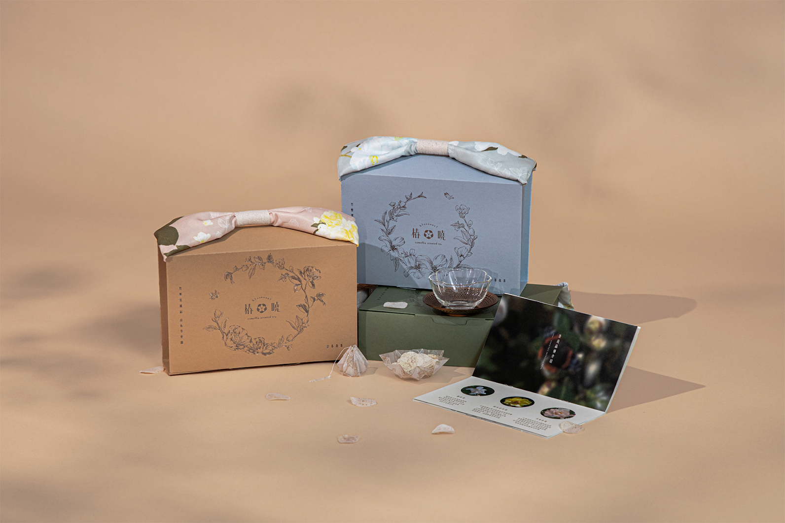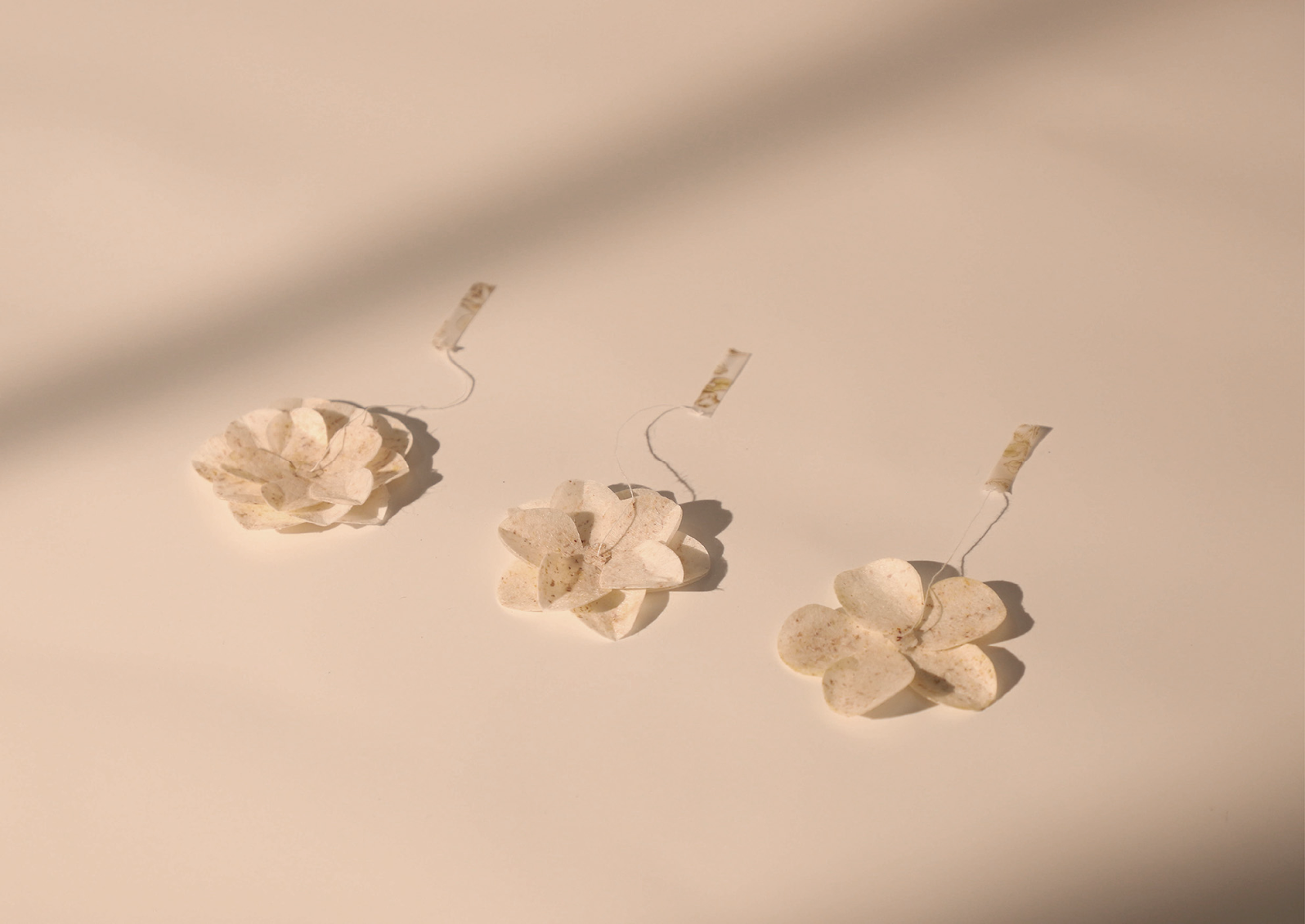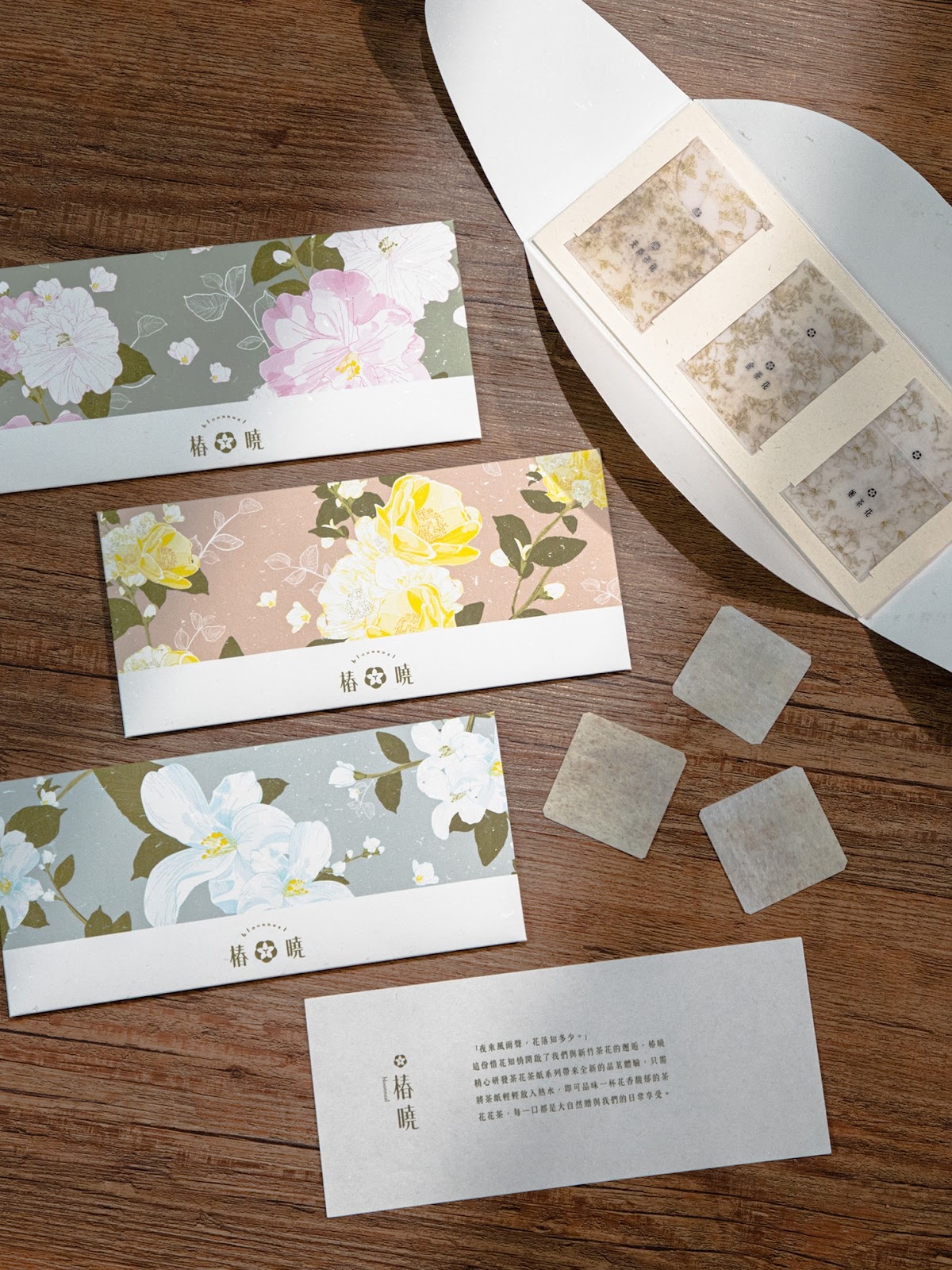 本系列選用新竹最具代表性的三種茶花品種──姬茶花、金茶花與天香茶花,透過造紙術,將茶花花瓣與天然植物纖維結合,製成三款可沖泡的茶花茶紙。設計上運用特殊結構,將花瓣造型的茶紙固定成花苞狀態,當其置入熱水中,花苞會隨著沖泡過程緩緩綻放,形塑一場結合視覺與味覺的飲茶體驗,為日常生活注入具儀式感的品茗時刻。